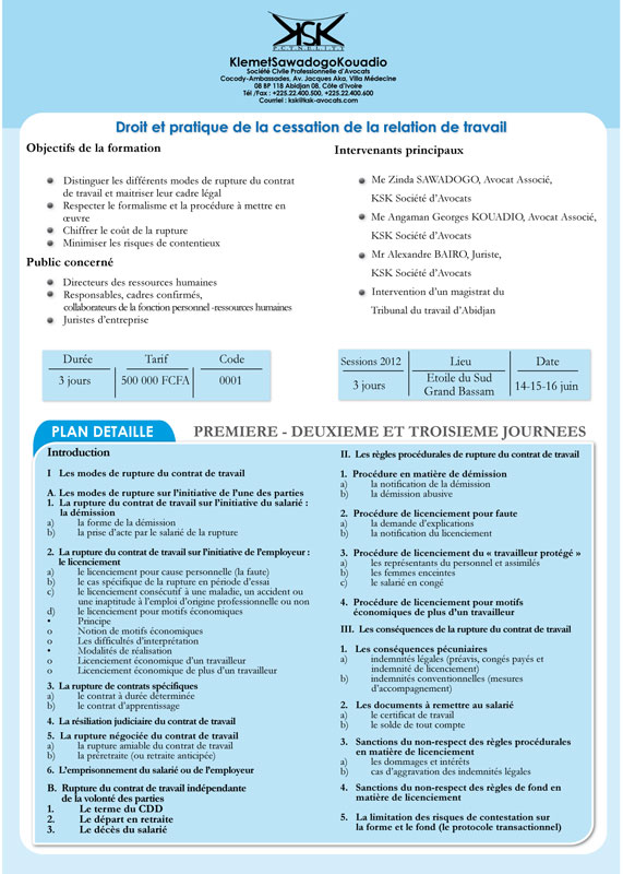 Le département Edition et Formation du Cabinet KSK a le plaisir de vous informer de l'organisation d'un séminaire de formation portant sur le thème : « Droit et pratique de la cessation de la relation de travail ».