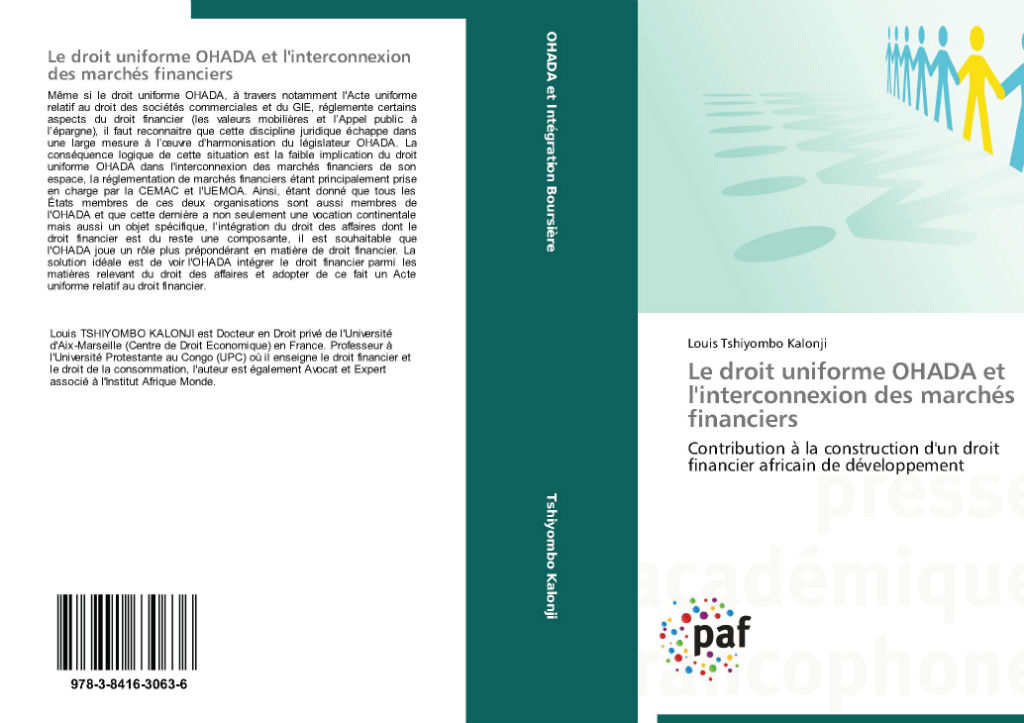 Nous avons le plaisir d'annoncer la parution aux Presses Académiques Francophones de l'ouvrage (615 pages) de Monsieur Louis TSHIYOMBO KALONJI intitulé : « Le droit uniforme OHADA et l'interconnexion des marchés financiers. Contribution à la construction d'un droit financier africain de développement ».