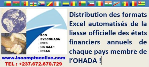 Pour rendre davantage opérationnel la pratique du SYSCOHADA révisé dans l'espace OHADA, LACOMPTAENLIVE informe tous les professionnels des métiers du chiffre et autres praticiens du droit comptable OHADA de la disponibilité des formats Excel automatisés de la liasse des états financiers de chaque pays membre de l'OHADA nécessaire pour réaliser soi-même ses déclarations annuelles de fin d'exercice comptable auprès des administrations fiscales.