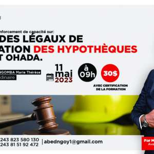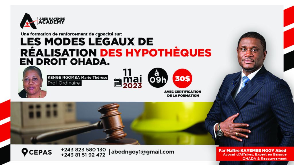 La Société Civile d'Avocats MAK, spécialisée en Droit des Affaires, Recouvrement, en Banque et spécialement en droit OHADA, en partenariat avec Abed KAYEMBE ACADEMY organise avec l'appui du Barreau de Kinshasa/Matete, une journée de renforcement des capacités juridiques et professionnelles sur les modes légaux de réalisation de l'hypothèque conventionnelle, légale et judiciaire en droit OHADA au regard des jurisprudences de la CCJA et des juridictions nationales de la RDC statuant en matière d'hypothèque, ce, à l'attention des usagers et praticiens des droits ainsi que des professionnels de commerce ou consommateurs des crédits bancaires dans la Capitale de la RDC, nous avons cité, la Ville de Kinshasa.