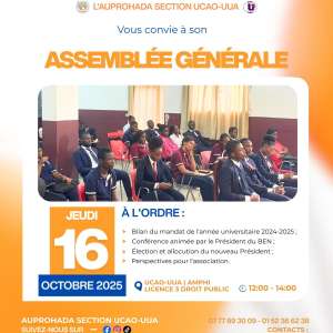 L'Association Universitaire pour la Promotion du Droit OHADA (AUPROHADA) Section Université Catholique de l'Afrique de l'Ouest - Unité Universitaire à Abidjan (UCAO-UUA) a le plaisir de convier l'ensemble de ses membres, sympathisants et partenaires à son Assemblée Générale, qui se tiendra le jeudi 16 octobre 2025, de 12h00 à 14h00, dans l'Amphithéâtre Licence 3 Droit Public de l'UCAO-UUA.