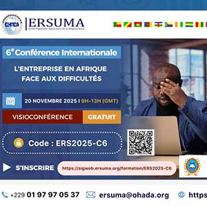 L'École Régionale Supérieure de la Magistrature (ERSUMA) de l'Organisation pour l'Harmonisation en Afrique du Droit des Affaires (OHADA), en partenariat avec l'Université de Dschang, l'Université Thomas SANKARA, l'Université de Bertoua, et le Cabinet Jurifis Consult, organise le jeudi 20 novembre 2025, sa 6e conférence internationale par visioconférence (Zoom) sur le thème : « L'entreprise en Afrique face aux difficultés ».