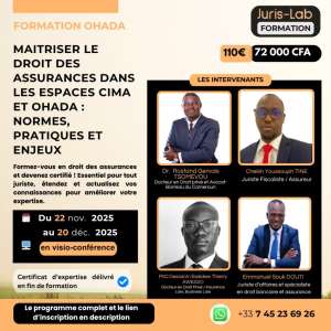 Lien d'inscription : https://www.juris-lab.com/products/maitriser-le-droit-des-assurances-dans-les-espaces-cima-et-ohada-normes-pratiques-et-enjeux