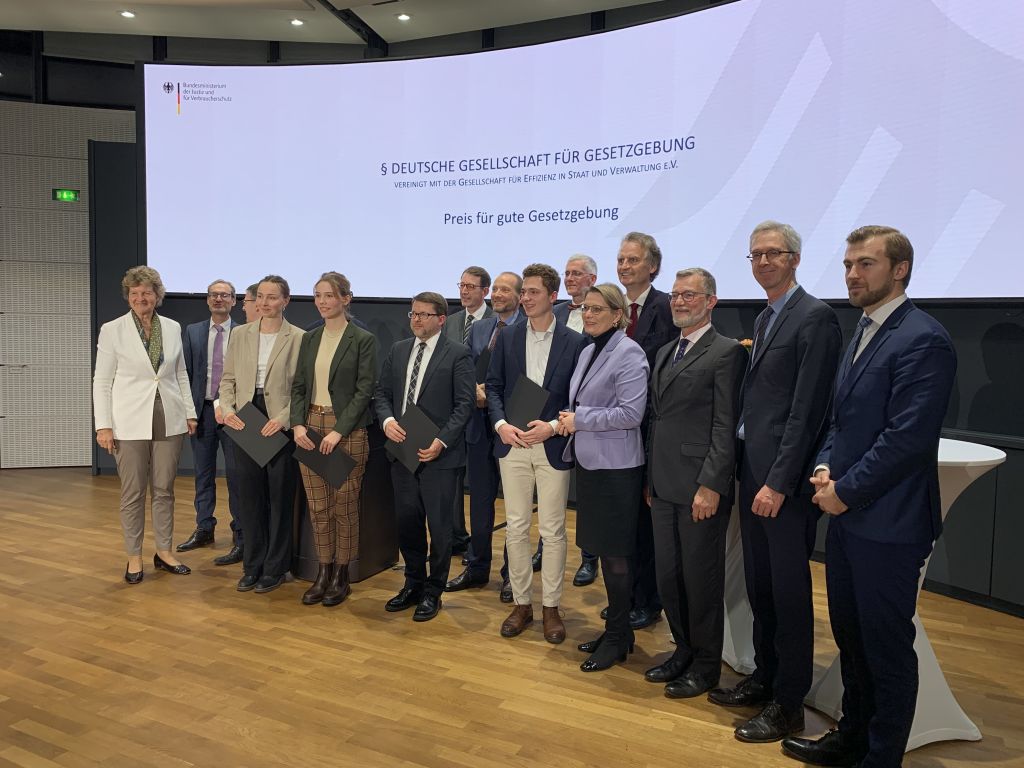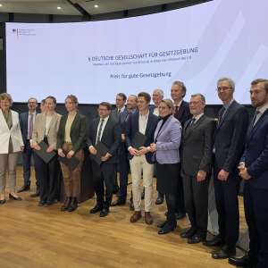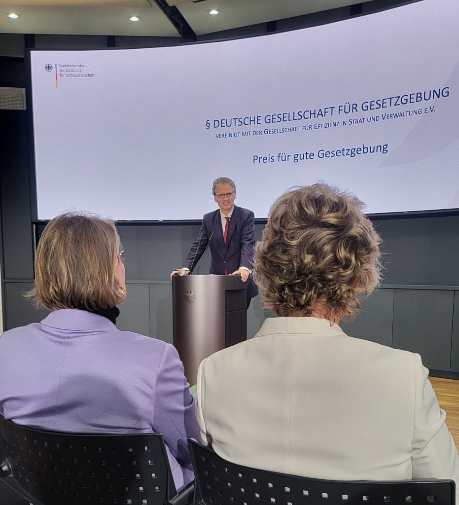 Die Association Henri Capitant erhielt am 10. November 2025 im Bundesministerium für Justiz und Verbraucherschutz in Berlin den „Preis für gute Gesetzgebung“ der Deutschen Gesellschaft für Gesetzgebung. Carl Philipp Sassenrath MdB, Mitglied des Rechtsausschusses des Bundestages, unterstrick in seiner Laudatio die Innovationen des Entwurf des europäischen Wirtschaftsgesetzbuches, wie die S.E.S. und die europäische Bürgschaft. Bundesjustizministerin Dr. Stefanie Hubig mahnte in ihrer Ansprache, dass der Rechtsstaat von innen und von außen unter Druck stehe. Dagegen steigern Qualität und Bestimmtheit von Normen die Akzeptanz des Rechtsstaates beim Bürger. Prof. Dr. Günter Krings MdB, Vorsitzender der CDU/CSU Landesgruppe NRW, merkte an, dass bis heute das Fach „Rechtsetzungslehre“ im Lehrplan von Universitäten regelmäßig fehlt. Außerdem müsse der Gesetzgeber Praktiker beim Gesetzesentwurf stärker einbinden. Als aktuelles Beispiel hob Krings die Einbeziehung der Anwender bei der Konzeption des Gesetzes zur Weiterentwicklung des Ausländerzentralregisters hervor.