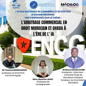 - Pr Bouchra JDAINI, Professeur de l'enseignement Supérieur en droit privé à l'ENCG d'Agadir, interviendra sur la thématique « Vers un arbitrage commercial intelligent : possibilités et contraintes à la lumière de la loi 95-17 ».