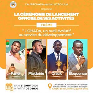 L'Association Universitaire pour la Promotion de l'OHADA (AUPROHADA) Section Université Catholique de l'Afrique de l'Ouest - Unité Universitaire à Abidjan (UCAO-UUA) a l'honneur de convier ses membres, sympathisants et partenaires à la cérémonie de lancement officiel de ses activités, qui se tiendra le samedi 31 janvier 2026, à partir de 8h, dans l'Amphithéâtre de la Licence 2 de la faculté de droit civil de l'UCAO-UUA.