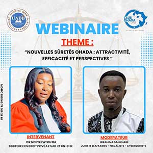 Le Club OHADA de l'Université Alioune Diop de Bambey (UAD) a le plaisir d'annoncer l'organisation d'un webinaire académique consacré au thème : « Nouvelles sûretés OHADA : attractivité, efficacité et perspectives », le samedi 31 janvier à partir de 17h15 en ligne sur la plateforme Google Meet.