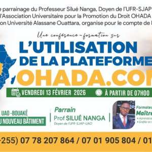 Sous le parrainage du Doyen de l'UFR des Sciences Juridiques, Administratives et Politiques, Professeur Nanga SILUÉ, l'Association Universitaire pour la Promotion du Droit OHADA (AUPROHADA-UAO) a l'honneur d'informer l'ensemble de la communauté estudiantine et universitaire de la tenue d'une conférence de formation exceptionnelle, placée sous le thème : « L'utilisation du site www.ohada.com », le vendredi 13 février 2026 à l'Université Alassane Ouattara de Bouaké, Salle 08, Nouveau Bâtiment, Campus 1.