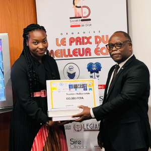 - Remise des récompenses : Après que le Dr Ravel DJIELON a donné lecture de la feuille des récompenses destinées à la lauréate, Me Emmanuel MASSODA a procédé à la remise du chèque d'une valeur de 100.000 FCFA à la lauréate et les ouvrages disponibles.