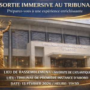 L'Association Universitaire pour la Promotion de l'OHADA, Section Université de l'Atlantique (AUPROHADA-UA), organise une sortie d'immersion au Tribunal de Première Instance d'Abobo le vendredi 13 février 2026 à 08h00.