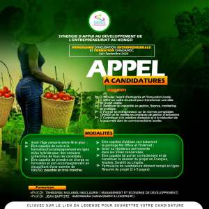 NB : Votre dossier de candidature doit être soumis à la succursale de votre ville. Le SADEK-RDC/GIE encourage particulièrement les femmes à saisir cette opportunité.