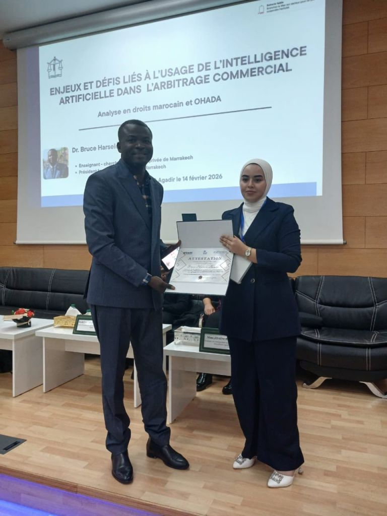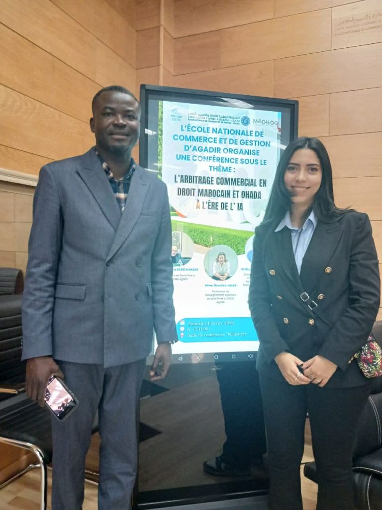 Le 14 février 2026 s'est tenue une conférence sur « l'arbitrage commercial en droits marocain et OHADA à l'ère de l'Intelligence artificielle » au sein de la salle de conférence WALLSTREET de l'ENCG d'Agadir de 15h30 à 17h30.