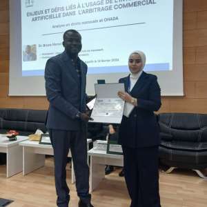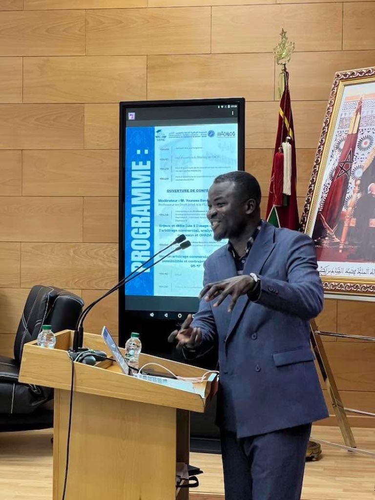 La deuxième intervention a été assurée par Dr Bruce Harsele ILEMBI, enseignant chercheur et Président du club OHADA Marrakech. Il a apporté ses éclairages sur « les enjeux et les défis résultants de l'usage de l'IA dans le contexte de l'arbitrage commercial : analyse en droits marocain et OHADA ».