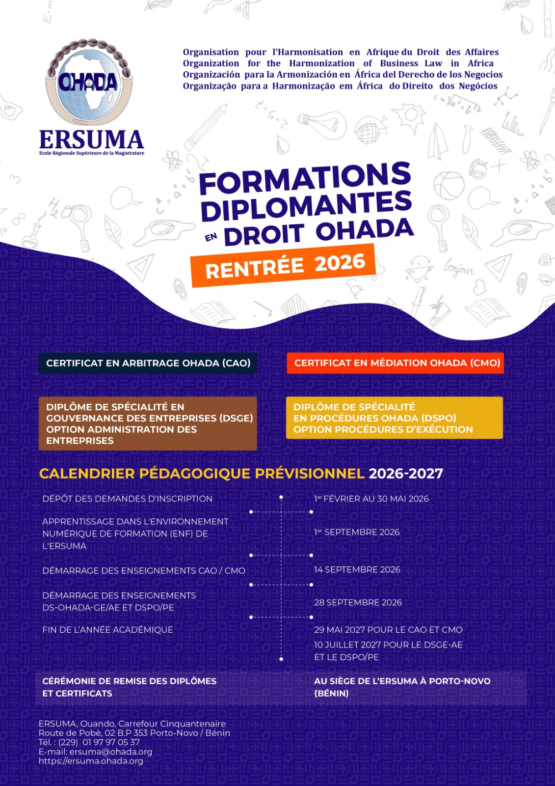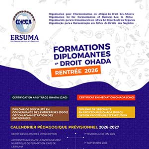 L'ERSUMA, École de droit des affaires de l'Organisation pour l'Harmonisation en Afrique du Droit des Affaires (OHADA), informe son grand public de l'ouverture des inscriptions au titre de la rentrée académique 2026-2027 pour les Diplômes de Spécialité en Gouvernance des Entreprises Option Administration des entreprises (DSGE-AE), en Procédures OHADA Option - Procédures d'exécution (DSPO-PE) et les Certificats en Arbitrage OHADA (CAO) et en Médiation OHADA (CMO).