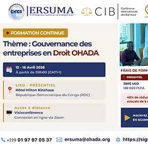 L'ERSUMA, École de Droit des affaires de l'Organisation pour l'Harmonisation en Afrique du Droit des Affaires (OHADA), en partenariat avec la Conférence Internationale des Barreaux (CIB) et l'Ordre National des Avocats de la RDC, organise à l'hôtel Hilton de Kinshasa et par visioconférence, les 15 et 16 avril 2026, une session de formation continue sur le thème : « Gouvernance des entreprises en droit OHADA ».