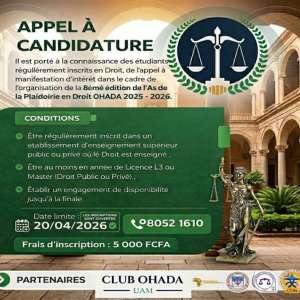 Il est porté à la connaissance des étudiants régulièrement inscrits en Droit, de l'appel à manifestation d'intérêt dans le cadre de l'organisation de la 8e édition de l'As de la plaidoirie en droit OHADA 2025-2025