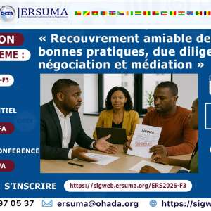 L'ERSUMA, École de Droit des affaires de l'Organisation pour l'Harmonisation en Afrique du Droit des Affaires (OHADA), organise à Douala (Cameroun) et par visioconférence, du 21 au 23 avril 2026, une session de formation sur le thème : « Recouvrement amiable de créances : bonnes pratiques, due diligence, négociation et médiation ».