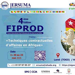 L'ERSUMA, l'École de droit des affaires de l'Organisation pour l'Harmonisation en Afrique du Droit des Affaires (OHADA), organise à l'hôtel Sarakawa de Lomé (Togo), du 20 au 23 mai 2026, la 4e édition du Forum international des professionnels du droit et du chiffre (FIPROD) sur le thème : « Techniques contractuelles d'affaires en Afrique ».